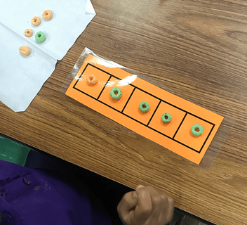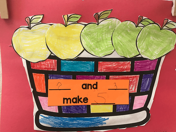 Grab a set of five frames, or ten frames, and some Apple Jack cereal and prepare for the fun! You can call out numbers and students will use the orange and green Apple Jack cereal to show ways to make the number. Can’t use food in your room? Use apple seasonal erasers or these apple math manipulatives from Amazon (affiliate link).