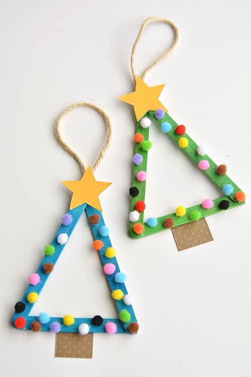 Popsicle Stick Christmas Trees- All you need it some popsicle sticks, mini pom poms, bells, sequins, or any other item to decorate the trees. Add some brown paper and a star to complete the tree.