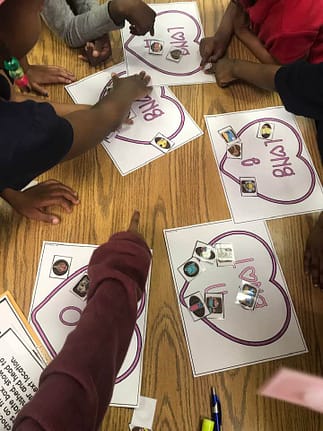3. Teacher-led Whole Group: Students work with their table partners to complete the task. This is similar to the parent-led groups, but the teacher reads the story and task directions to the whole class at one time. I just prepare one set of task activities for each table group and they work with their table mates to complete the tasks. Once they are done with the tasks, I would have them cheer on the table next to them.