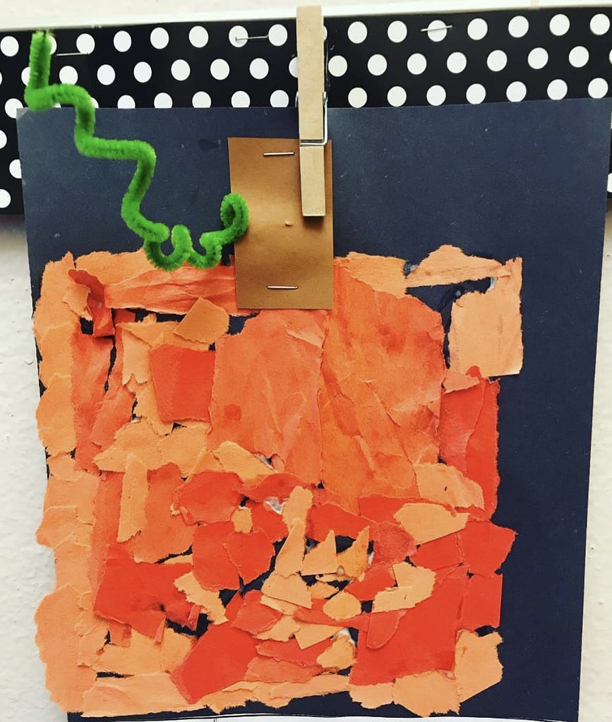Torn paper crafts are not only extremely adorable, they are also a great way to practice fine motor skills. There are so many different themes you can use to complete the activity. Simply choose your theme first. Next, print a picture of an object (or draw with white crayon on black paper like we did here). Give your students colored paper to rip and glue on their paper.