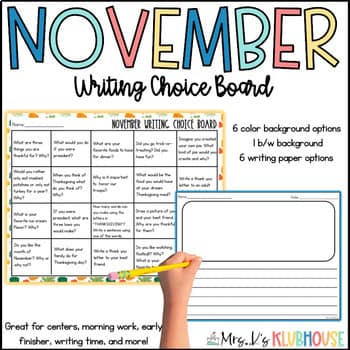 This November Writing Choice Boards comes with 1 choice board (with 6 color options and 1 black and white page). It also has 6 different lined paper options.
